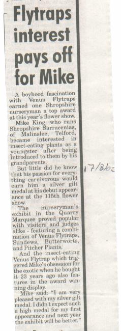 2002 August 16th and 17th First exhibit at the Shrewsbury flower show, launched 'Shropshire Sarracenias' as a specialist internet based nursery for main line and rare forms of Sarracenia. The display was awarded a silver gilt medal.